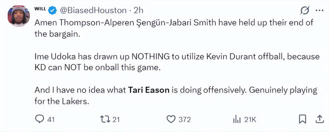 火箭记者Bradeaux:求求乌度卡,让塔里-伊科回替补席去吧。